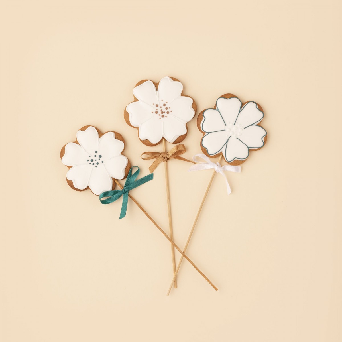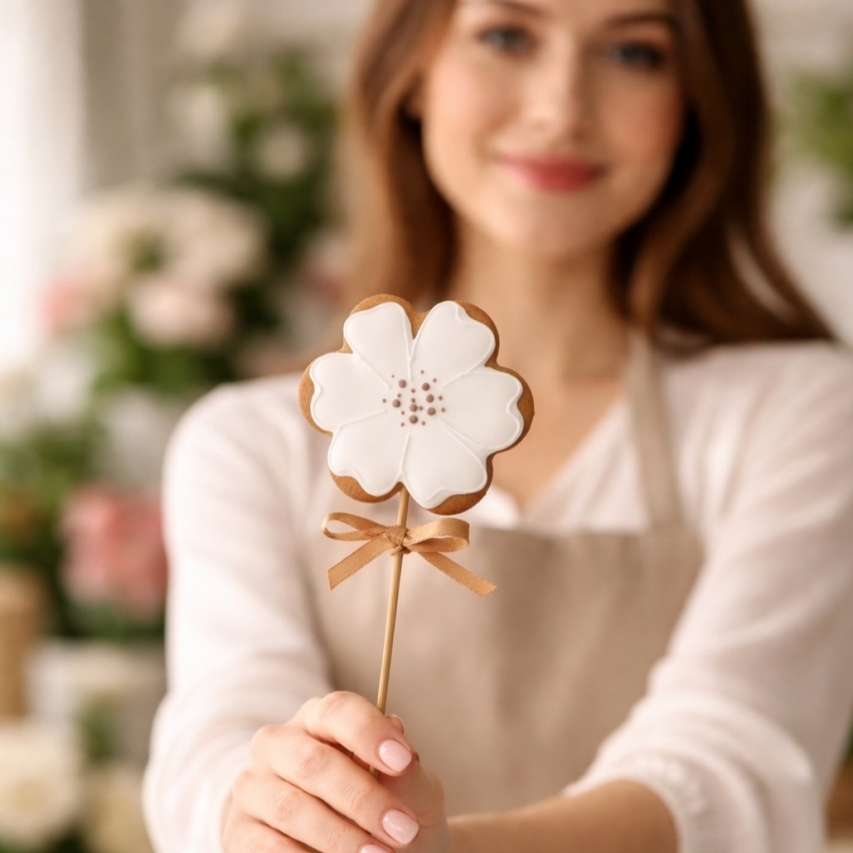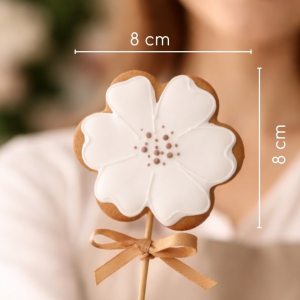 8 cm flower-shaped gingerbread on a stick, packaged in a clear bag tied with a ribbon.